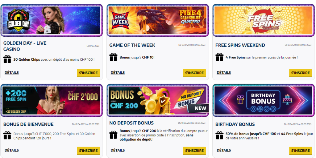 À noter que seules les personnes qui s’inscrivent pour la première fois sur Swiss4win ont droit à ce bonus de bienvenue. La durée de validité des bonus, comprenant les 2000 CHF , les 200 tours gratuits et les 30 golden chips, est de 120 après leur réception.